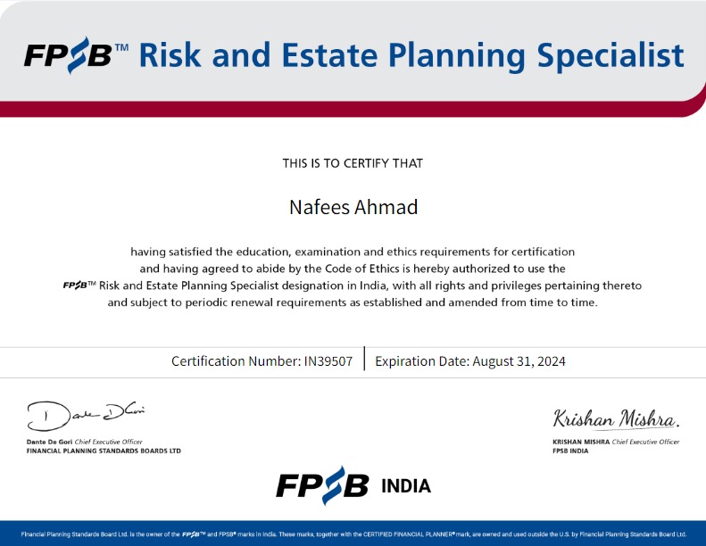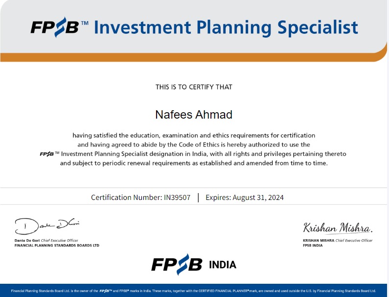 I had a great experience consulting Nafees ji! His extensive knowledge of market investments, mutual funds, and insurance policies really stood out. What I appreciated most was how he tailored his guidance specifically to my needs, ensuring I understood every step of the way. It wasn’t just about numbers — it was about building confidence in my financial decisions.I would highly recommend him to anyone looking for honest, insightful, and expert financial advice!