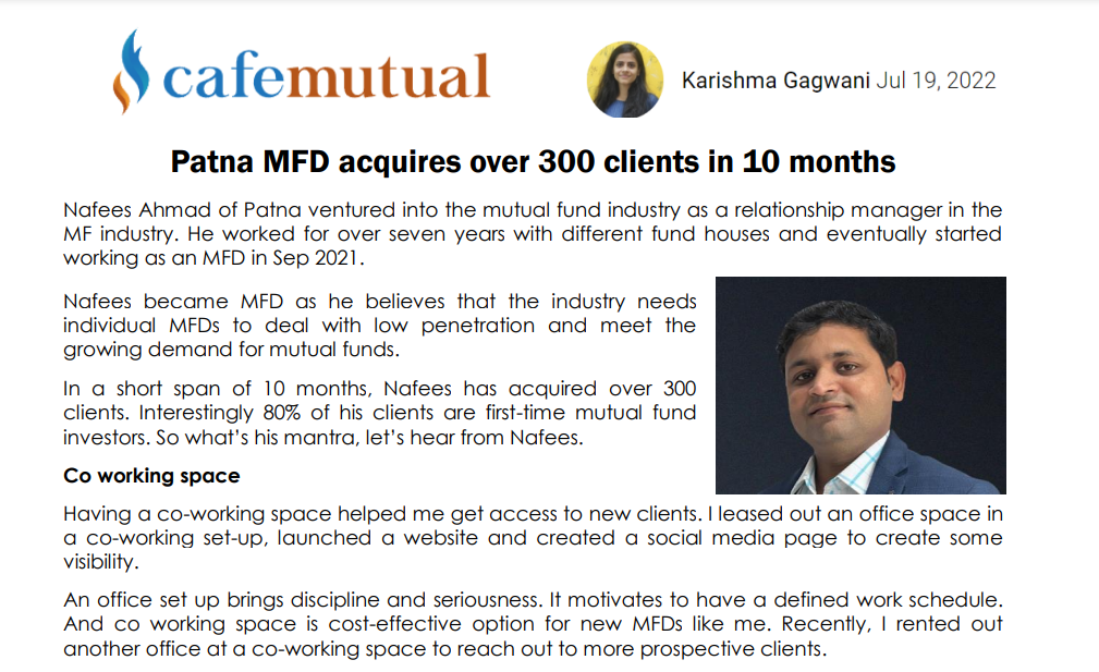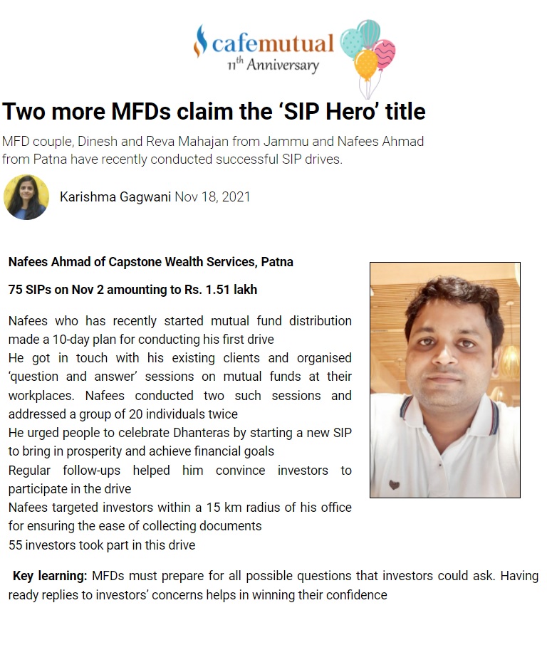 MFD couple, Dinesh and Reva Mahajan from Jammu and Nafees Ahmad from Patna have recently conducted successful SIP drives. This Article is Featured On Cafe Mutual, Click Here To Read